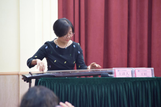 讲座现场气氛轻松活跃,王虹在古琴名曲鉴赏环节中还不时以现场弹奏的方式进行举例讲解互动,为师生们展示古琴的魅力。