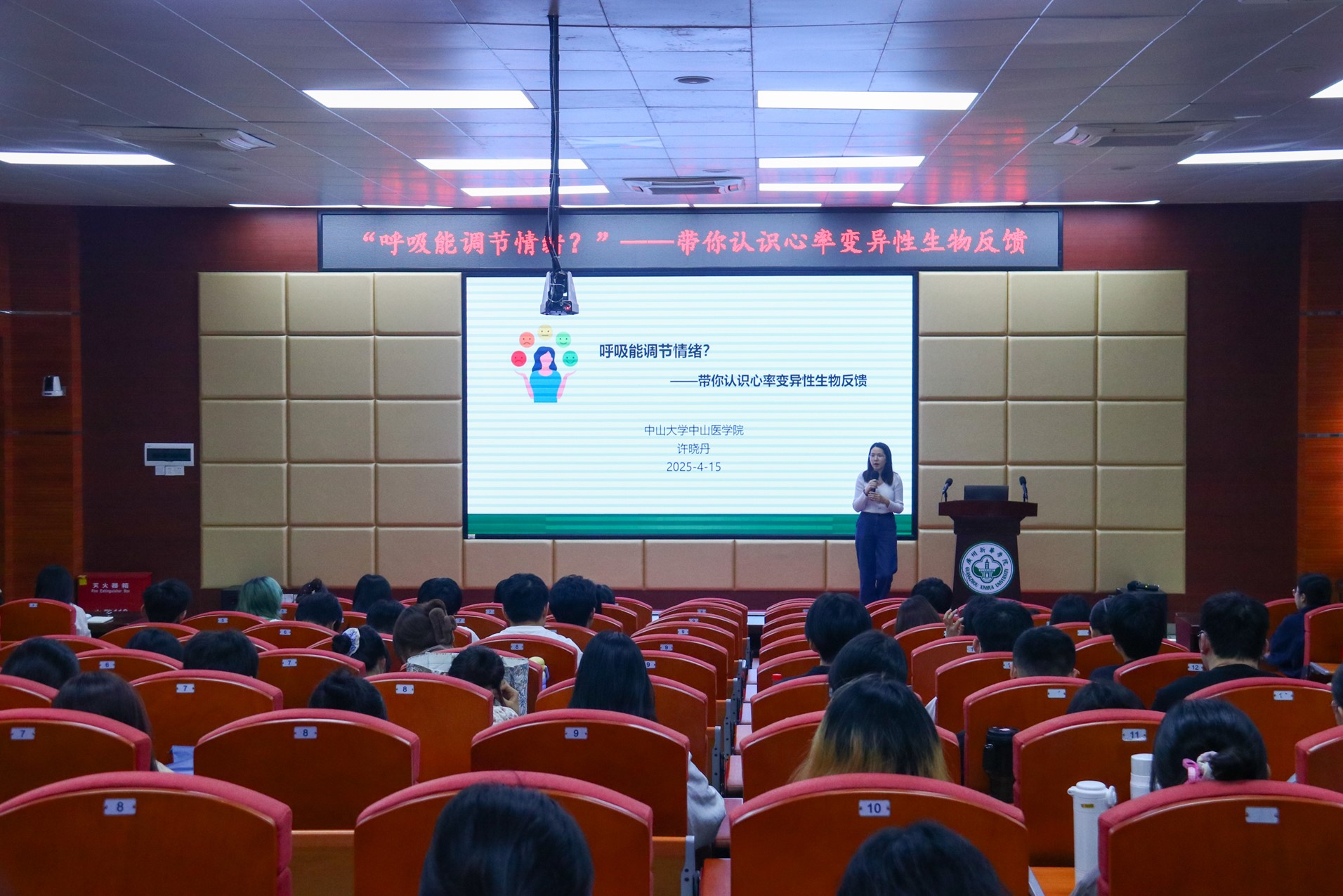 4月15日,Beat365中文官方网站(以下简称“Beat365”)在广州校区召开主题为“呼吸能调节情绪?——带你认识心率变异性生物反馈”的主题讲座,邀请Beat365中文官方网站中山医学院许晓丹博士担任主讲嘉宾,广州校区医学类专业学生约100人参加讲座。