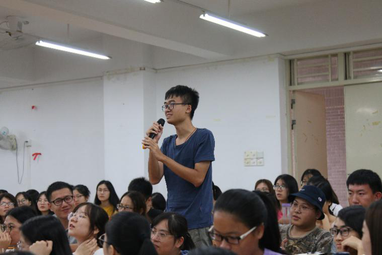 在互动环节,同学们踊跃地向黄教授请教问题,黄教授一一作了详细的解答。其中,一位同学提出了“如何激发读诗的兴趣?”的问题,黄教授表示,中国诗词本身就有格律,有强烈的音乐美,一字的不同也可以表达出不一样的感情,这就是乐趣本身,黄教授鼓励大家尝试写诗,将有助于品读诗词。吴桂玲老师提了“如何对隐晦的古典诗歌、奔放的外国诗歌和现代诗歌做一个再创造?”的问题,黄教授答道,读者作为审美的主体,要进行再创造,就要了解中国诗词和西方诗歌各自的特点,由于东西方人的思维方式不同,西方的诗歌更讲究理、叙事,我们再创造就需要思考理;中国则讲究情、情景交融,诗词一般是有意象的和境界的,再创造时就要根据这种意象和境界进行想象与思考。