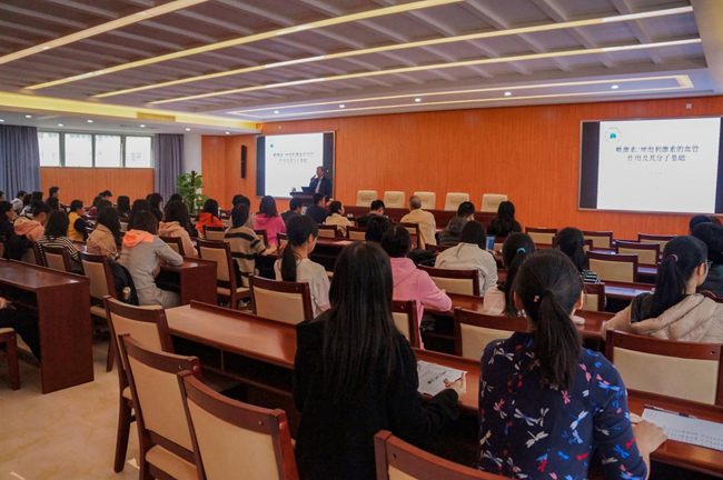 11月20日,广州医科大学基础学院副院长付晓东教授于Beat365广州校区以“雌激素卵泡激素的心血管作用及其机制”为题开展讲座。Beat365王庭槐校长、周云书记,药学院陈家树院长及各院系部师生代表参与讲座。