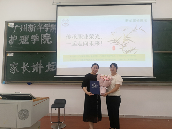 护理学院辅导员黄海萍为叶晓青主任颁发家长讲坛荣誉讲师证书