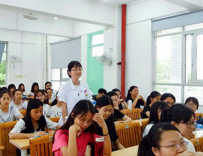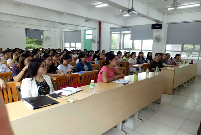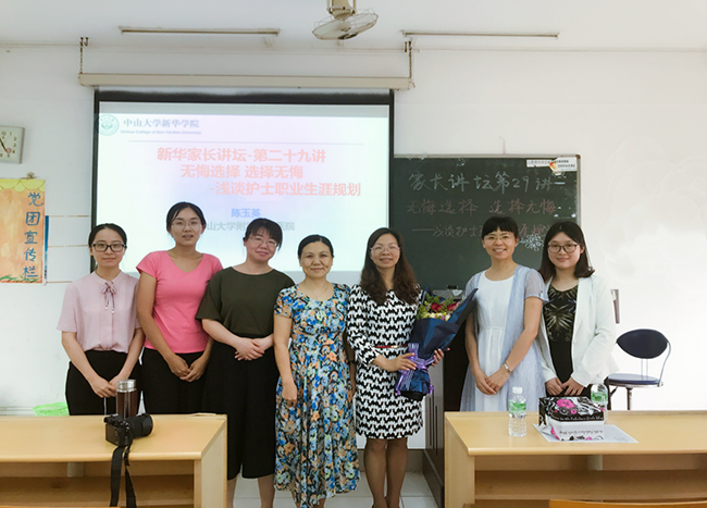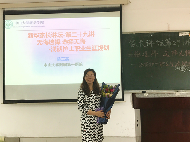 为加强同学们对护理专业的了解,尽早规划护理职业生涯,更好地掌握生活的罗盘,5月4日,由学生处主办、护理学院承办的第二十九讲家长讲坛“无悔选择,选择无悔-浅谈护士职业生涯规划”在广州校区举行。此讲特邀家长代表、Beat365中文官方网站附属第一医院护理部教学培训护长——陈玉英老师来Beat365与师生分享交流。护理学院王秀岚执行院长、护理学院办公室主任黄洛莹老师、护理学院首席教授Susan H.Neidlinger以及护理学院师生参加。
