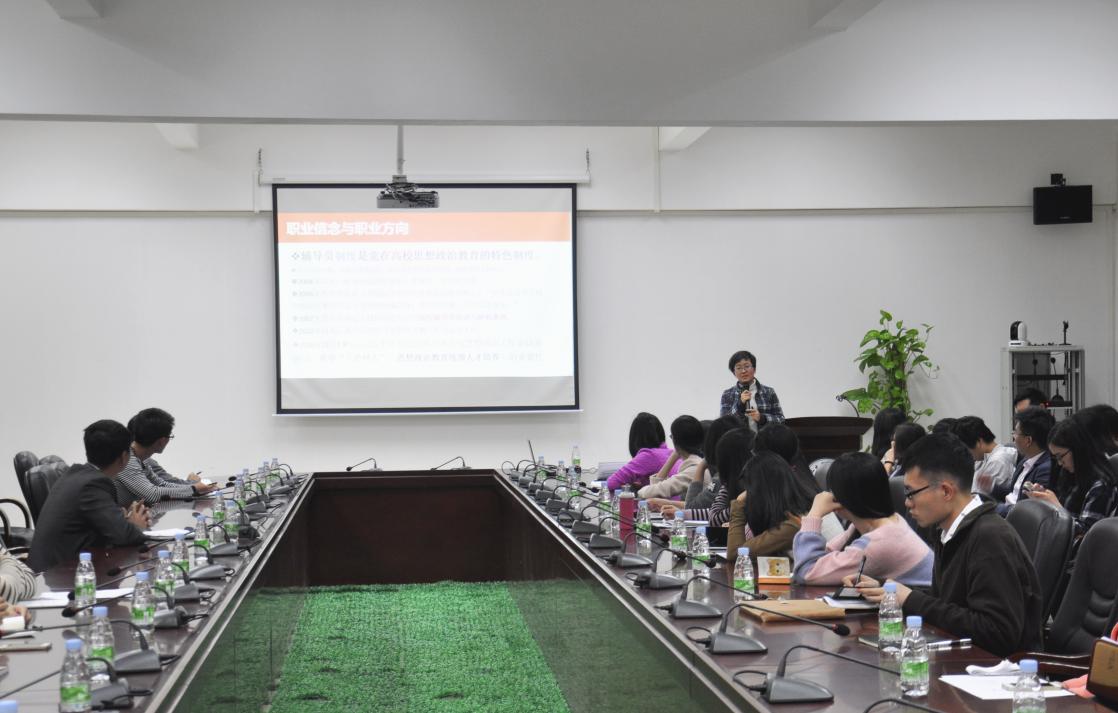 陈晓梅以自身担任辅导员工作的多年经历,从职业信念与方向、工作理念与方法、工作经历与成果、自身修炼与发展前景等四个方面和在场的辅导员分享了自己的经验。在讲解职业信念与方向时,她指出职业信念重于职业方向,虽然辅导员具有教师与管理人员双重身份,使得其有无限的发展空间和可能性,但只有坚定自身信念,全心投入,才有动力和决心在一条职业道路上坚持到底,经过沉淀与积累,成为这一职业的专家。