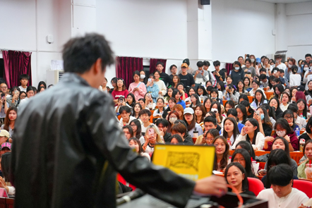 谈及作品制作技巧,王凯曦邀请现场的同学们上台进行角色扮演,让同学们亲自体验创作选题的乐趣。他鼓励同学们积极尝试,在实践中积累经验,提升技能。现场讲座气氛热烈,师生们热情高涨,踊跃提问交流。