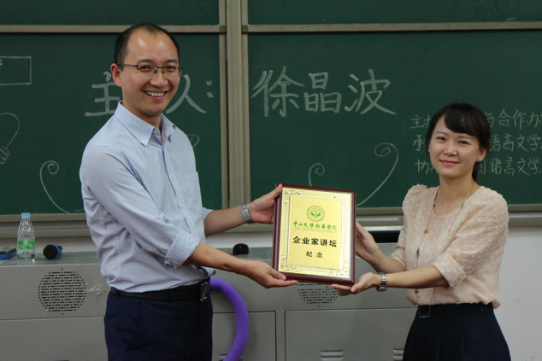 讲座的最后,外语系办公室副主任欧衍伽代表外语系师生向徐晶波副总经理颁发了企业家讲坛纪念证书,感谢徐总为新华师生带来了一场如此内容丰富的讲座。