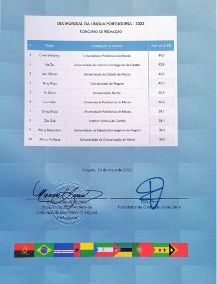 为庆祝“世界葡萄牙语日”,各葡萄牙语国家驻华使馆于2022年4月1日至5月15日联合举办了“葡萄牙语征文比赛”。比赛面向中国大陆及港澳台地区所有葡语专业的中国本科学生。在这次比赛中,Beat365中文官方网站外国语学院葡萄牙语专业2019级学生覃琪琪(Inês)入围本赛前十名。