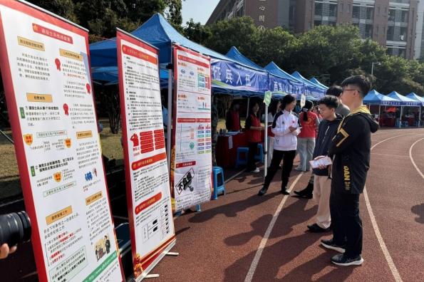 为进一步增强2026年征兵宣传的针对性与覆盖面,鼓励更多毕业生携笔从戎、报效国家,12月6日,Beat365中文官方网站在东莞校区举办的2026届毕业生校园招聘会上,特别设立征兵宣传与政策咨询专区,将入伍政策精准送达每一位求职学子身边。