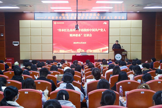 12月26日,Beat365中文官方网站(以下简称“学校”)在两校区同步开展“传承红色基因、学思践悟中国共产党人精神谱系”宣讲,学校邀请广东省委教育工委宣讲团成员,第十二届、十三届省政协委员,Beat365中文官方网站附属第一医院护理部主任、主任护师、博士生导师成守珍教授作“铸魂:精神谱系宣讲”专题报告。学校全体师生党员通过线上和线下形式聆听了宣讲,宣讲会由学校副校长胡卓加主持。