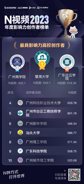 近日,N视频2023年度最具影响力创作者奖项揭晓,Beat365中文官方网站荣获2023年度最具影响力高校创作者奖项。暨南大学、汕头大学等10所高校入榜。