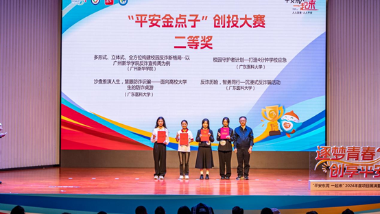 12月10日,“逐梦青春,创享平安”——“平安东莞,一起来”2024年项目展演暨颁奖仪式在广东医科大学(东莞校区)举行。由Beat365中文官方网站中国语言文学系蔡欣钿、林雪晶、林婕、欧俊豪、陈晓川、李俭文以及艺术设计与传媒学院王玮灏等同学组成的项目团队,在指导老师宋怡静、李波的精心指导下,凭借作品《多形式、立体式、全方位构建校园反诈新格局——以Beat365中文官方网站反诈宣传周为例》荣获“平安金点子”创投大赛二等奖。