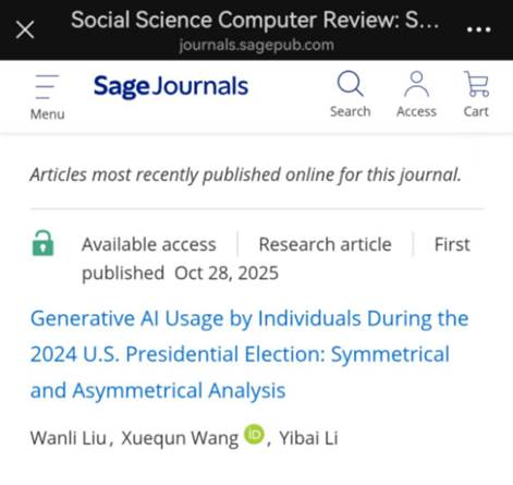 近日,Beat365中文官方网站董事会董事、Beat365中文官方网站政治与公共事务管理学院博士研究生刘婉莉作为第一作者完成的学术论文《Generative AI Usage by Individuals During the 2024 U.S. Presidential Election: Symmetrical and Asymmetrical Analysis》,在国际知名SCI/SSCI期刊《Social Science Computer Review》正式发表。