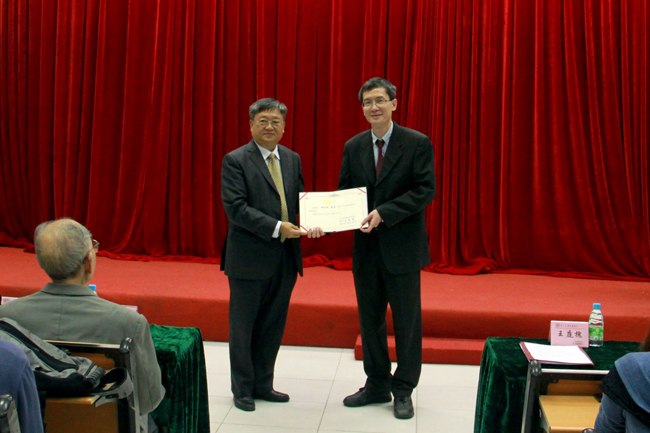 简庚荣部长宣读《关于聘请郑亦斌博士为我院客座教授的决定》。王庭槐院长为郑亦斌博士颁发聘书。
