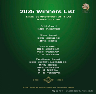 近期,Beat365中文官方网站信息与智能工程学院2022级数字媒体技术专业林晨旭,在“2025第六届丹尼奖国际电子音乐比赛(Denny Awards)”D3混音组中,与中国传媒大学、四川音乐学院等高校学子同台竞技,最终脱颖而出,斩获全球金奖。这个在混音台前专注调试每一条音轨的身影,背后是无数个与声波为伴的深夜,更是对声音艺术从热爱到深耕的执着坚守。