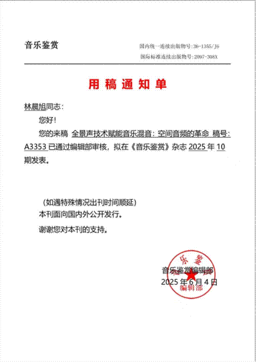 对于林晨旭而言,丹尼奖的金奖不是结束,而是更广阔征程的开始。他说:“这座奖杯提醒我,要永远保持对声音的敬畏和追求。”值得一提的是,林晨旭同学的论文《全景声技术赋能音乐混音:空间音频的革命》已通过审核,拟于2025年10月发表于《音乐鉴赏》杂志,实现了“赛事成果与学术研究”的联动。未来,他计划将赛事经验转化为更多学术成果,继续探索数字音乐与技术融合的边界。