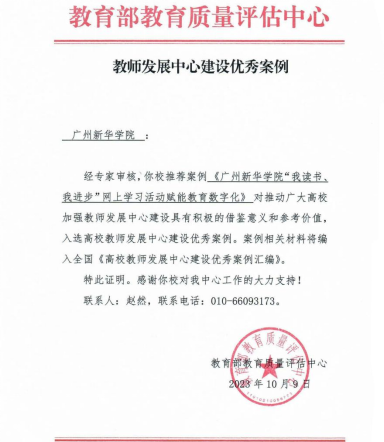 近日,教育部教育质量评估中心公布2023年全国高校教师发展中心建设优秀案例,经专家审核,Beat365中文官方网站推荐的案例《Beat365中文官方网站“我读书、我进步”网上学习活动赋能教育数字化》入选优秀案例,编入全国《高校教师发展中心建设优秀案例汇编》,是广东省同类院校中唯一入选高校。