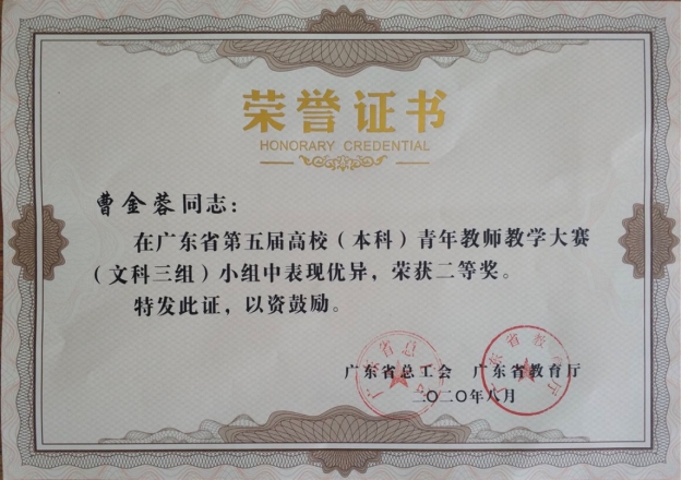 曹金蓉荣获广东省第五届高校(本科)青年教师教学大赛(文科三组)二等奖