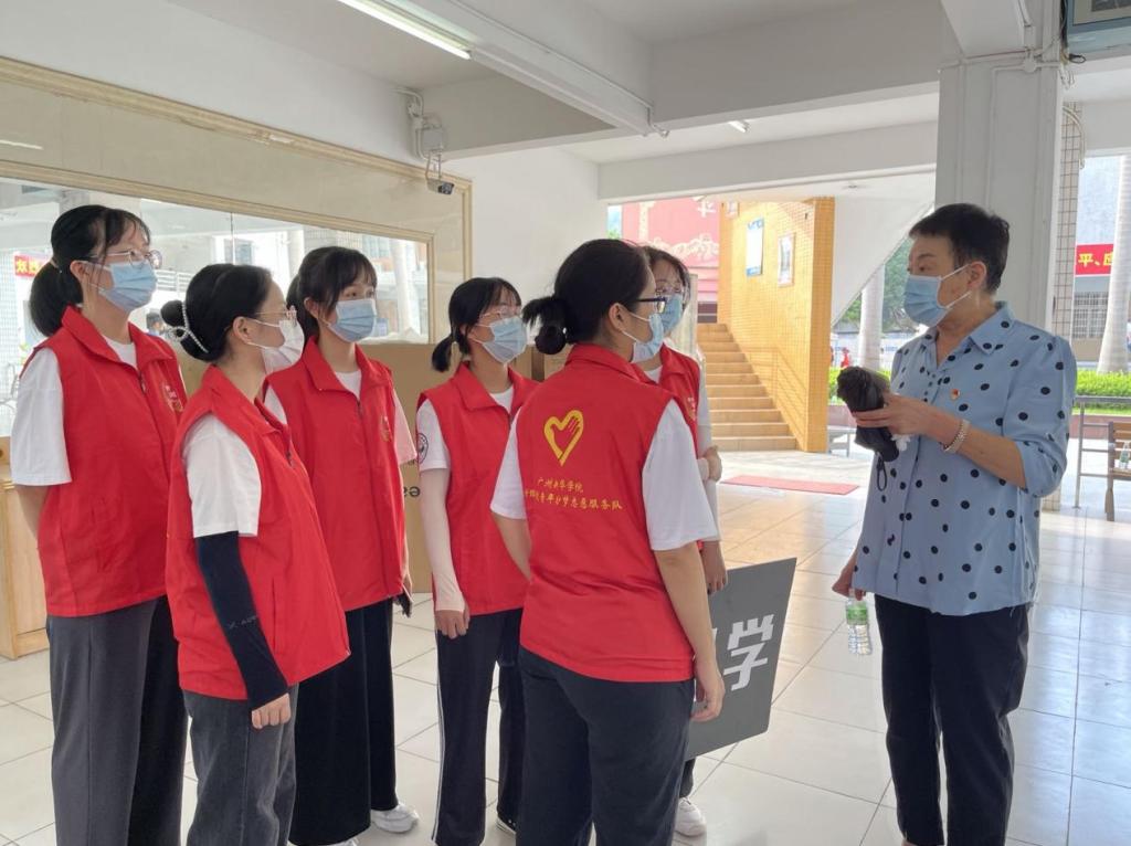 于凤兰(右)在新生报到点为护理学院志愿者团队作工作部署(2021.9.12)