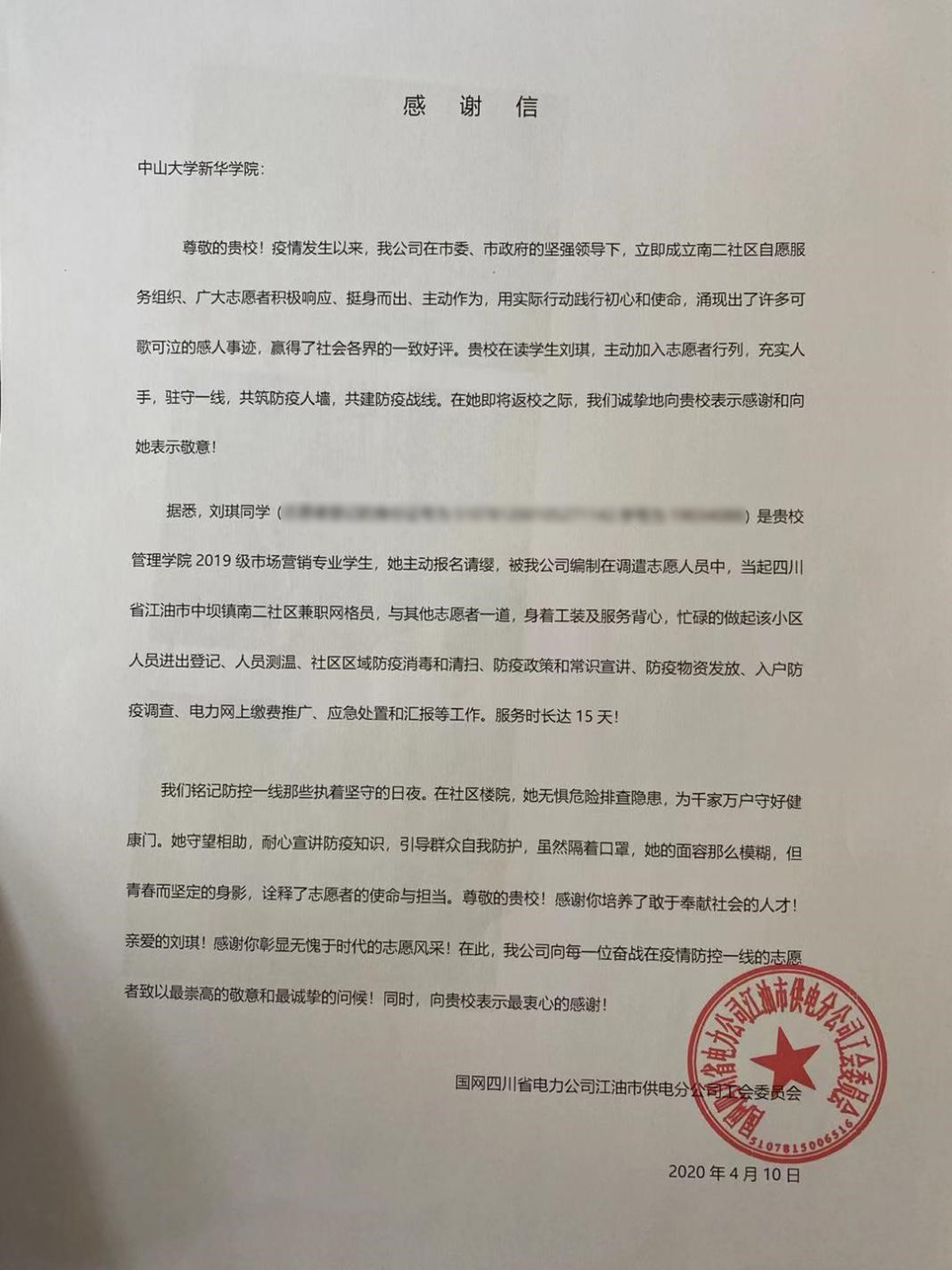 国网四川省电力公司江油市供电分公司工会在信中表示,中大新华在读学生刘琪在南二社区主动加入志愿者行列,充实服务组织人手,挺身而出,驻守一线,共筑防疫人墙,共建防疫战线,赢得了社会各界的一致好评。习近平总书记强调,“青年一代有理想、有本领、有担当,国家就有前途,民族就有希望。”刘琪一直牢记总书记的教诲,积极参与抗疫志愿活动,帮助更多的人树立抗击疫情的坚定信念。成为一名青年志愿者是她步入大学后的理想,刘琪表示,“我只是众多青年志愿者中的普通一员,还有很多青年大学生为抗疫奋斗,例如北京大学的援鄂医疗队,他们都是青年榜样,用实际行动彰显新时代新青年的青春蓬勃的力量,担起当代新青年的责任与使命。”
