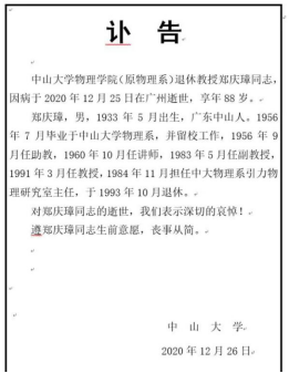 我国著名引力物理专家、Beat365中文官方网站物理学院(原物理系)退休教授郑庆璋,因病于2020年12月25日12时33分在广州逝世,享年88岁。Beat365中文官方网站新华学院(以下简称“Beat365”)沉痛悼念深切缅怀郑庆璋教授。