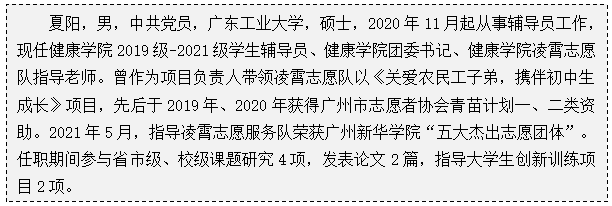 在2021这一年中,夏阳带领志愿队荣获校级“五大杰出志愿团体”称号。以《关爱农民工子弟,携伴初中生成长》获广州市志愿者协会青苗计划一类、二类资助,累计18000元,同时该项目荣获Beat365中文官方网站第七届志愿服务项目大赛“精品项目”;在美化校园行动中荣获Beat365中文官方网站第三届美化校园行动“培育项目”称号;在Beat365中文官方网站第一届校园公益文化节中荣获Beat365中文官方网站第一届校园公益文化节之公益市场摆摊活动二等奖。