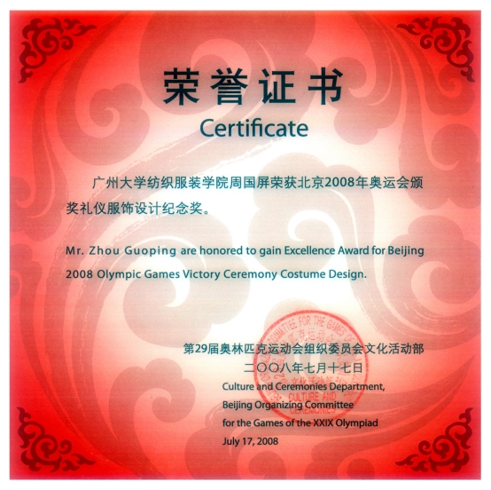 “北京2008年奥运会颁奖礼仪服饰设计纪念奖”